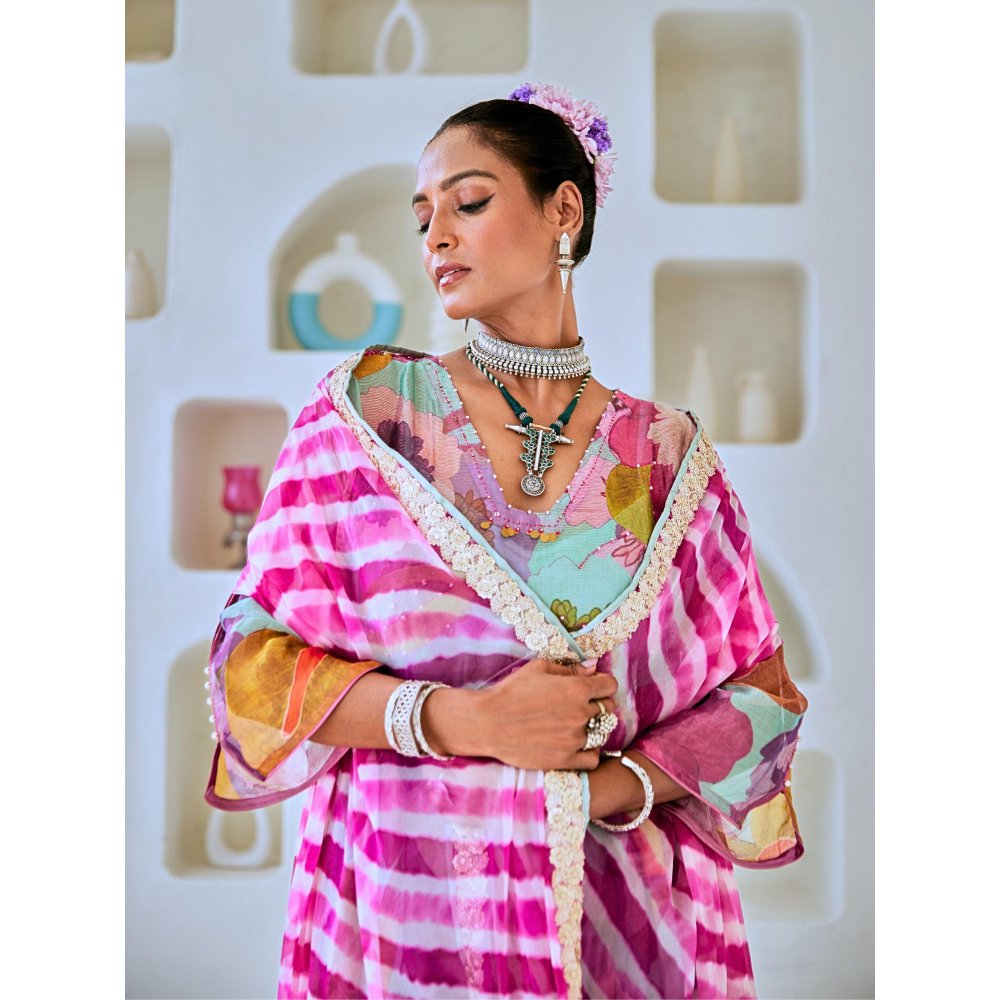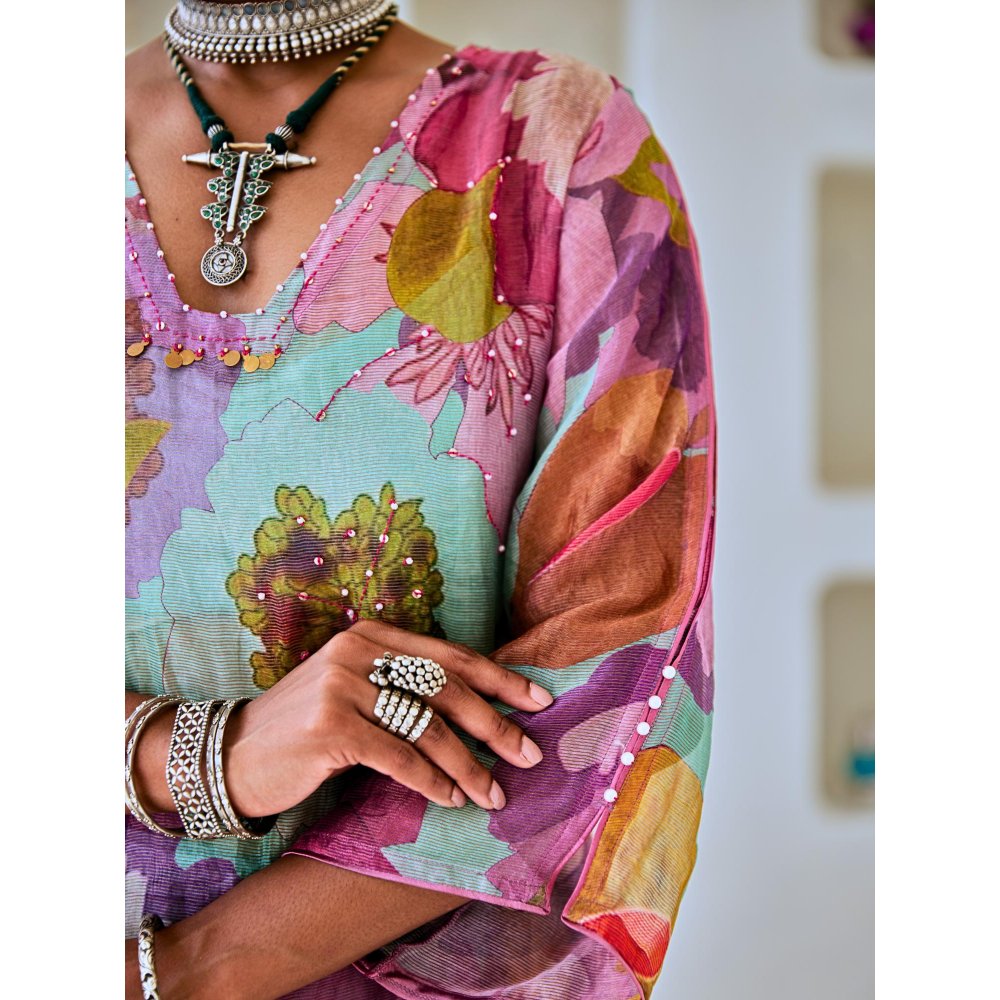Description : A Vibrant Kurta Set In Aqua Blue With Beautiful Floral Prints - Crafted In Rich Tissue Zari With Intricate Hand-Work Details. Its Paired With Fuchsia Leheriya Dupatta & Cotton Pants.
