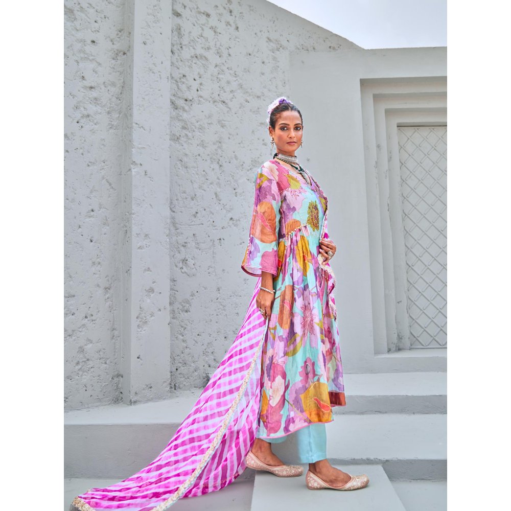 Aqua Blue Floral Embellished Tissue Kurta with Pant Leheriya Dupatta (Set of 4)