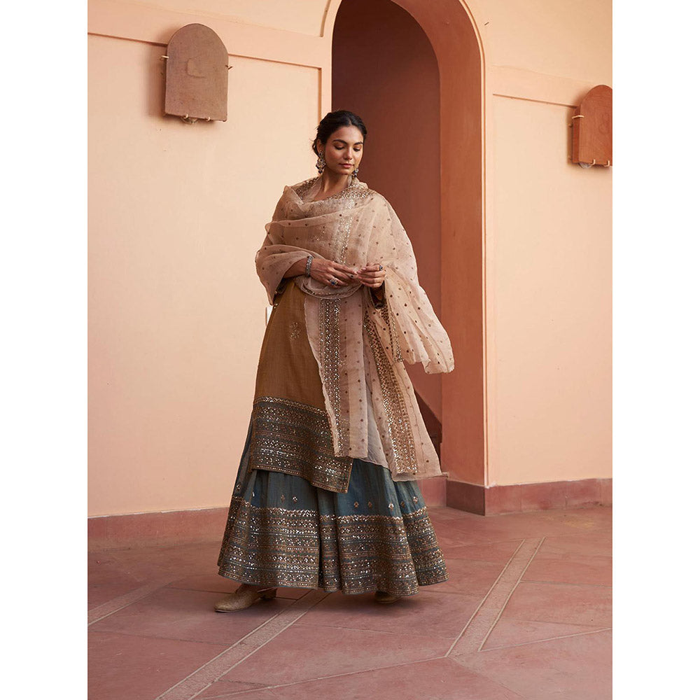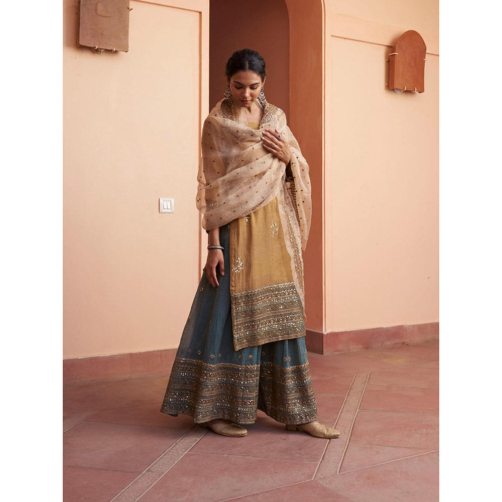 Description : A Tissue Kurta In Golden Dark Beige With Heavy Sequin And Thread Border At The Hem And On The Sleeves Highlighted With Hand Embroidered Bootys. A Sharara In Tissue With A Heavy Embroidered Border At The Hem. A Dupatta In Organza With Thread And Sequin Embroidery On All Four Sides With Tiny Booties All-Over.