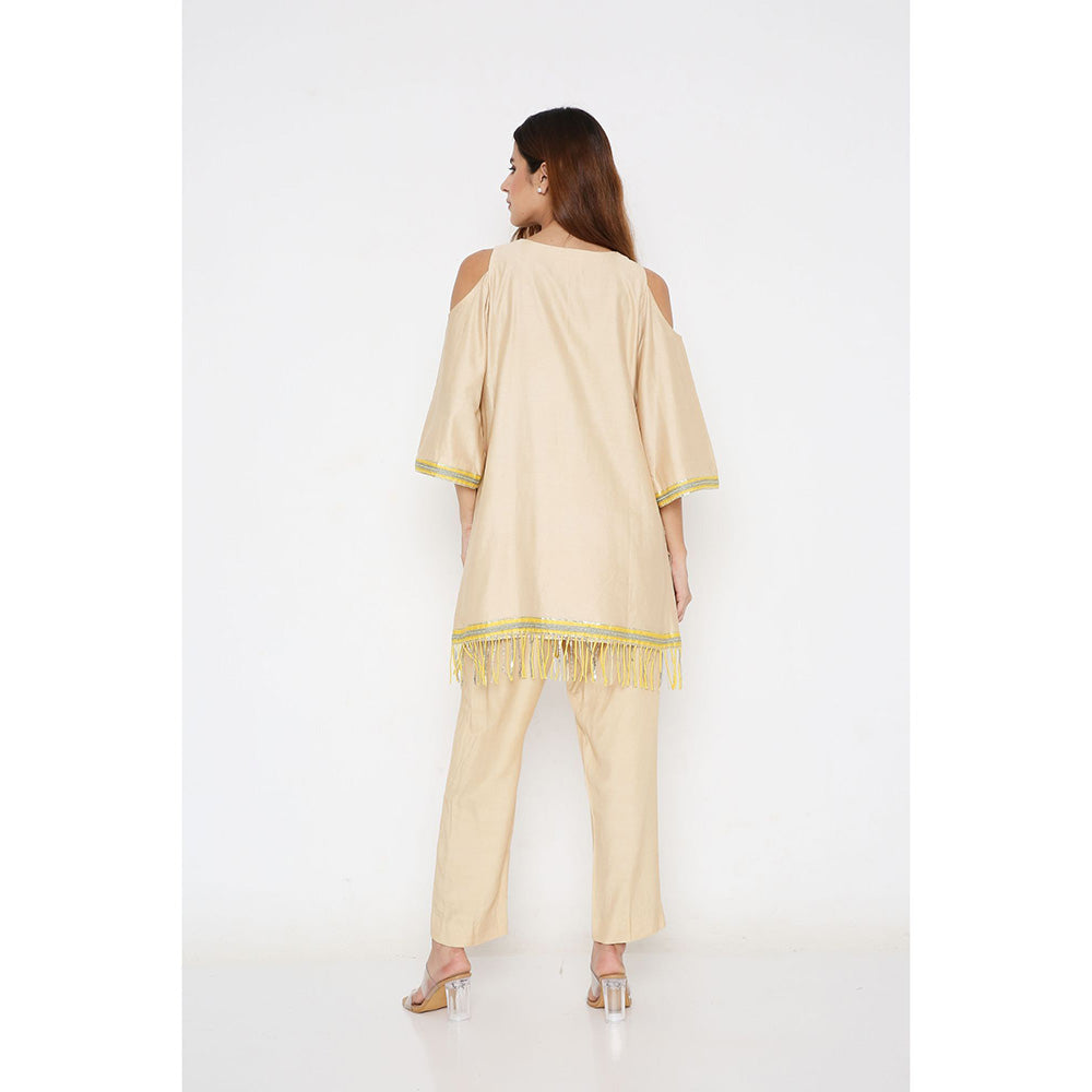 Beige Chanderi Gota Stripe Short Kurta with Pants (Set of 2)