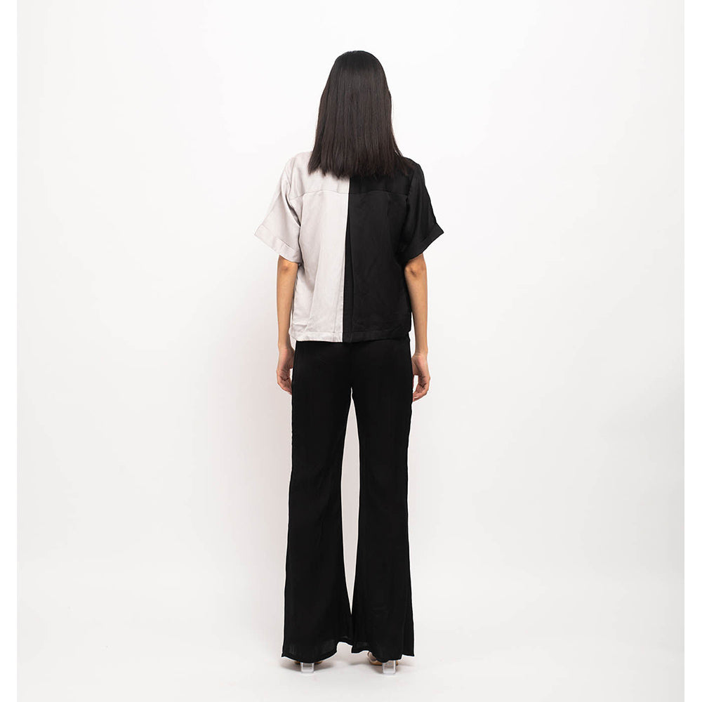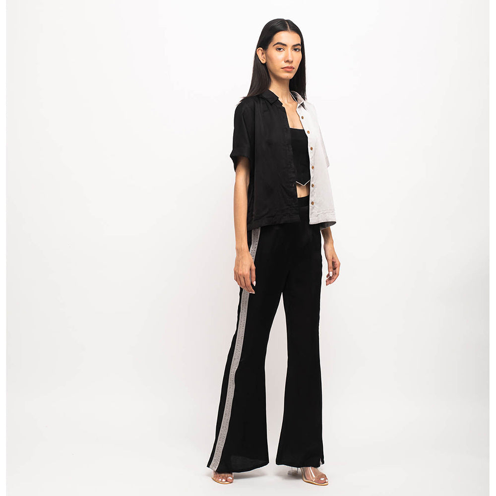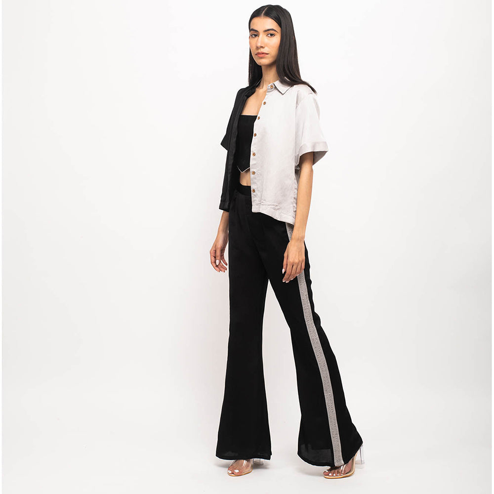 Description : Black-Grey Three Piece Set With Half And Half Crop Shirt, Black Bustier With Grey Pipin Throughout And Black Pants With Rouching On Either Sides. It is designed to ensure optimum room for ease of movement. It is sure to fetch you from all. Join the league of fashion elites flaunting the staple.