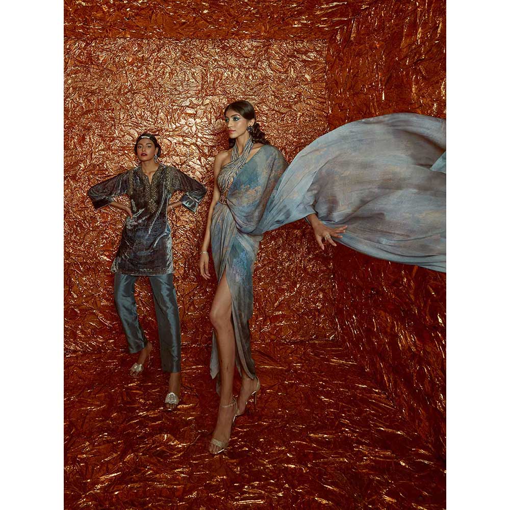 Description : Halter Neck Hand-Embroidered Blouse with Cording detailing, Draped Chiffon Saree and Hand-Embroidered Belt