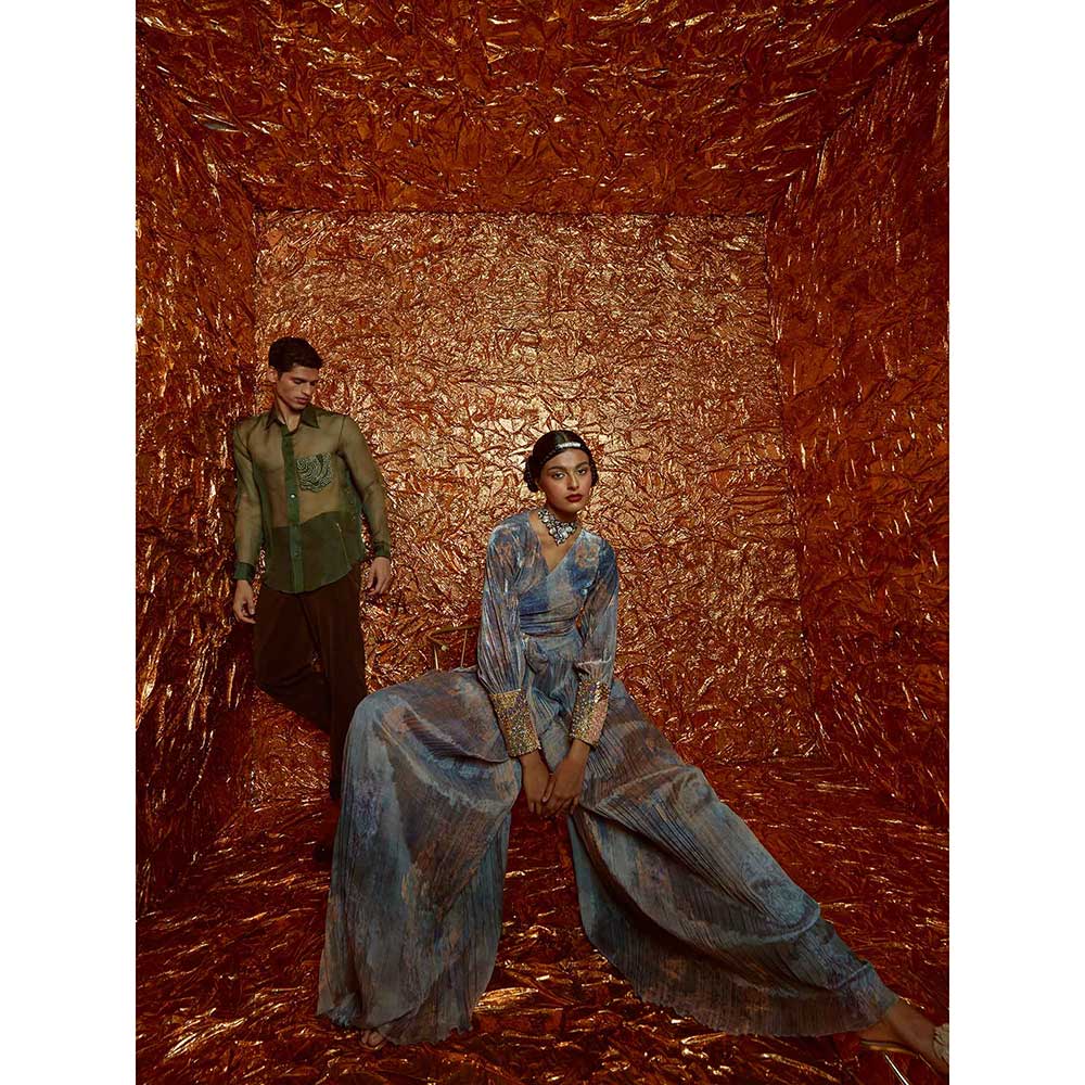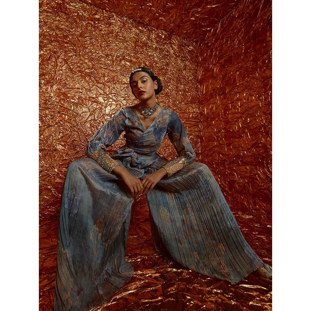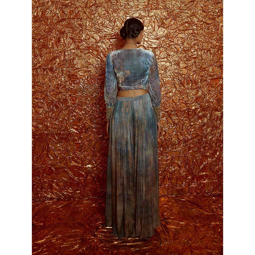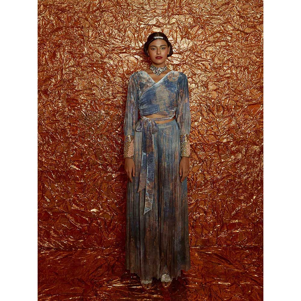 Description : Velvet Printed Wrap Around Tie Up Top with Hand-Embroidered Cuff and Printed Sharara