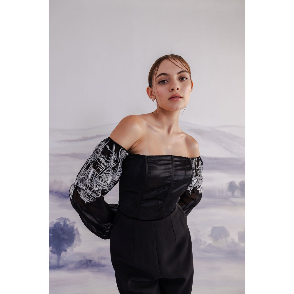 Orthodox Black Off-Shoulder Satin Corset Pearl Cuffs-Top