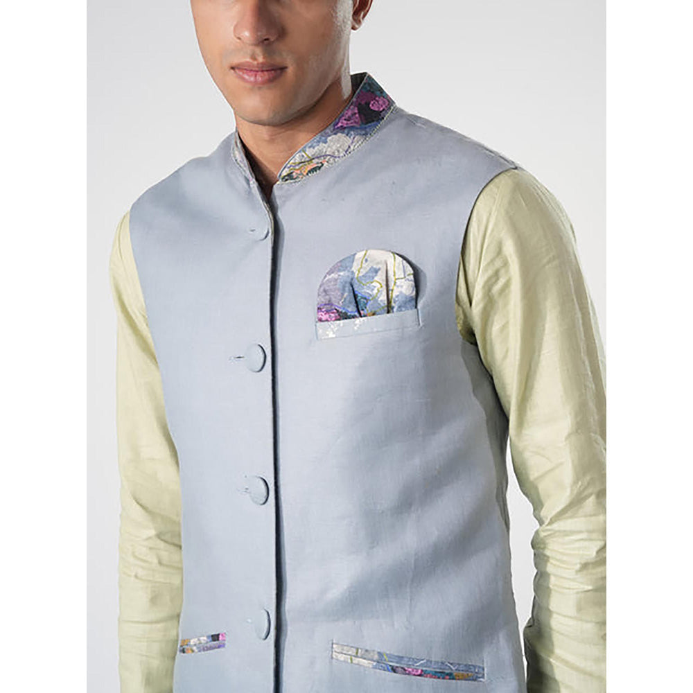 Description : This sleeveless jacket exudes timeless elegance with a modern twist. It features a mandarin collar adorned with subtle patterned detailing, adding a refined touch. The front is neatly designed with fabric-covered buttons and two welt pockets accented by vibrant patterns, along with a matching pocket square for added sophistication. The hem showcases intricate embroidery, adding a delicate yet striking detail. Perfect for formal or festive occasions, this jacket pairs seamlessly with both traditional and contemporary outfits, offering a polished and versatile look.