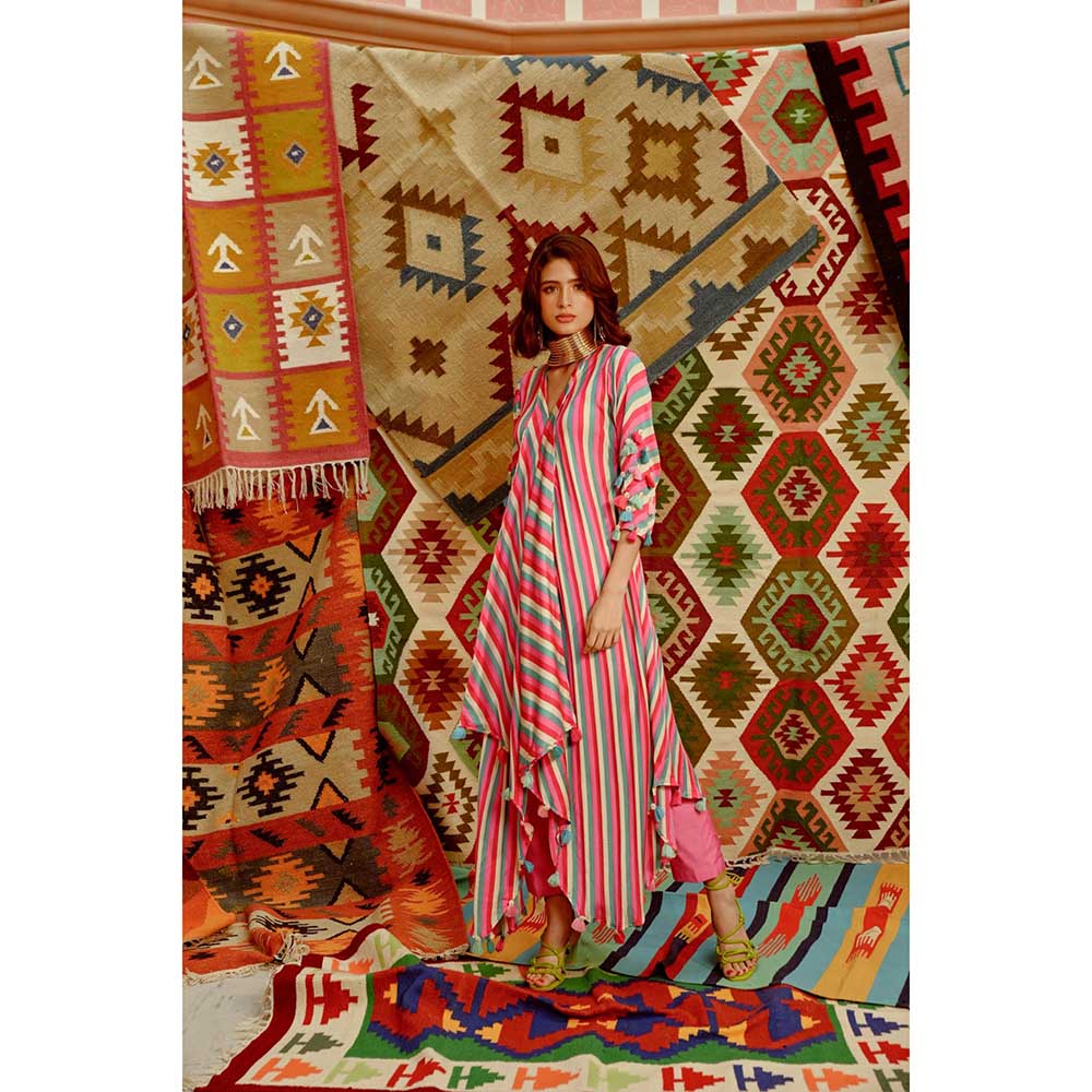 PALLAVI JAIPUR Hot Pink Indi-Leheriya Tassel Kurta with Pant (Set of 2)