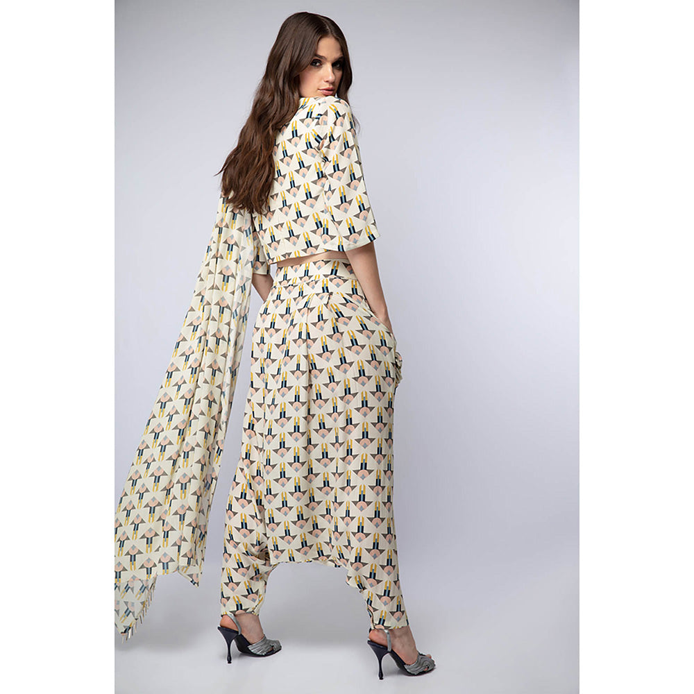 Description : White Arrow Print Crepe Crop Top with Low Crotch Pant and Attached Georgette Drape with Tassels