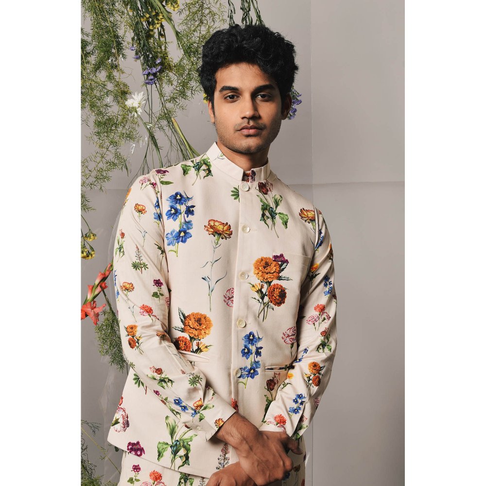 Description : Floral print bandi constructed with a lush cotton satin fabric. This bandi features laser cut mother of pearl shell buttons, a mandarin collar, one chest pocket and two hip pockets. This is a single product and does not include a kurta and pajama. Please note - No two laser cut mother of pearl buttons will be exactly the same, which adds to the uniqueness of this piece.