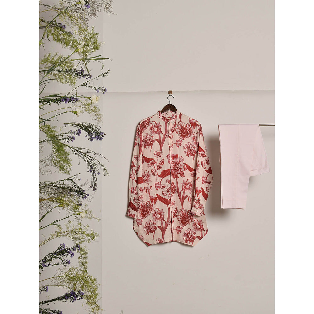 Description : Floral print shirt style kurta constructed with a rich linen satin fabric. This kurta comes with a mandarin collar, cuffed sleeves, two hip pockets on each side and has an angular hemline. This is a 2 piece set complete with a matching trouser style cotton Pant. The trouser style Pant features an elasticated back, zip and fly front closure and two hip pockets. The Pant is cut to a slim fit and has ankle slits for ease of wear.