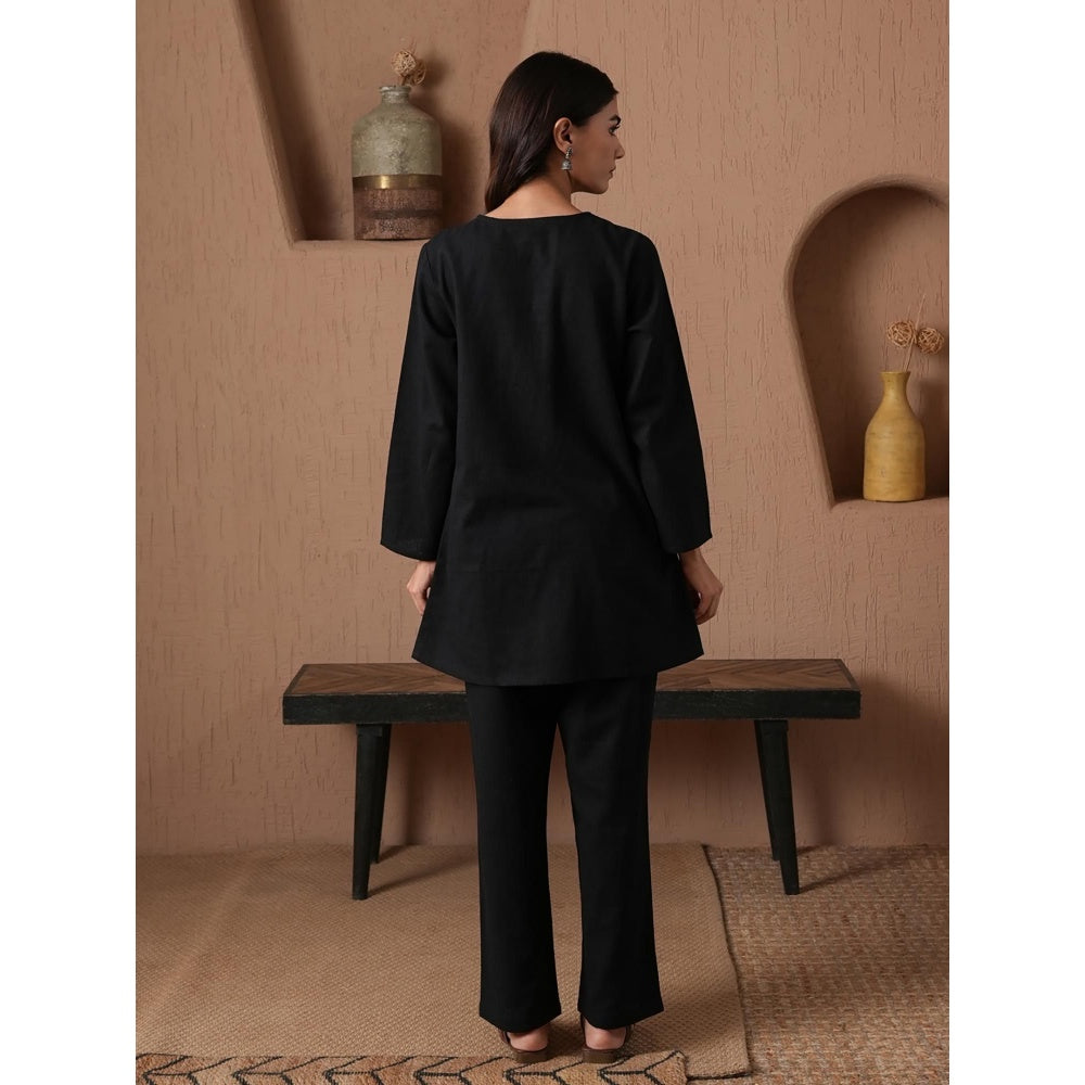 Description : Garner all the attention in this black co-ord set from QAZMI. Crafted from cotton linen, this alluring set is finished with full sleeves and a v-neck. Team this set with a pair of heels and minimal jewellery.