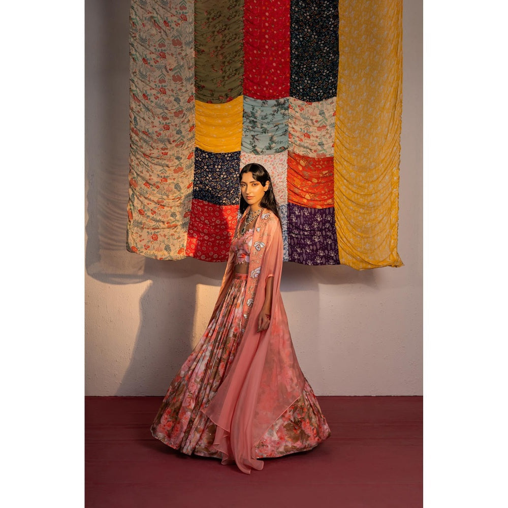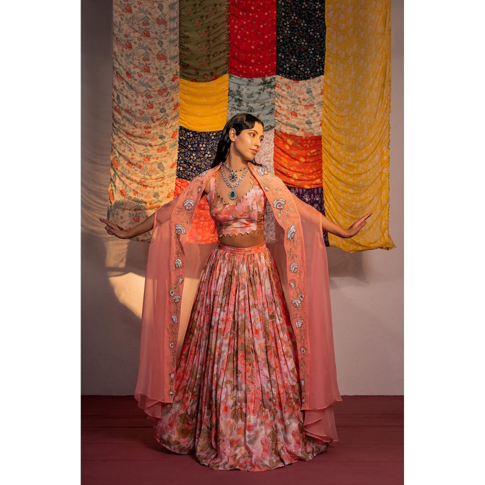 Redpine Designs Coral Printed Lehenga with Bustier and Cape (Set of 4)