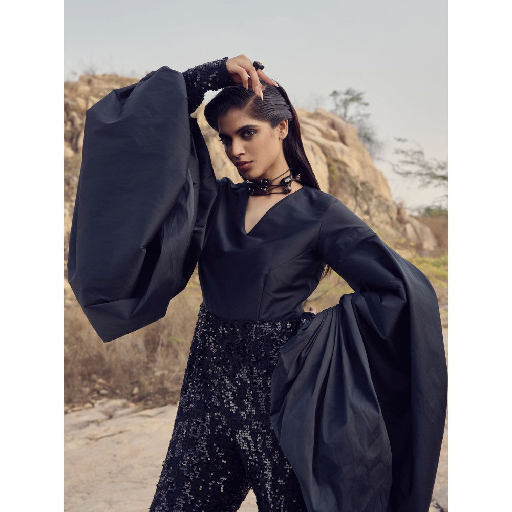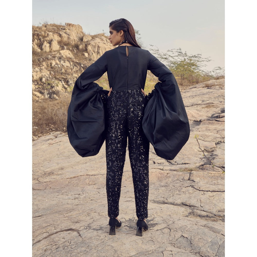 Description : Experience comfort in style with this black jumpsuit from RENASCI. Made from high-quality cotton. It features flared sleeves, a embellished & sequined pattern, finished with a rise style. Style it with minimal jewellery ad sadals to complete the ensemble.