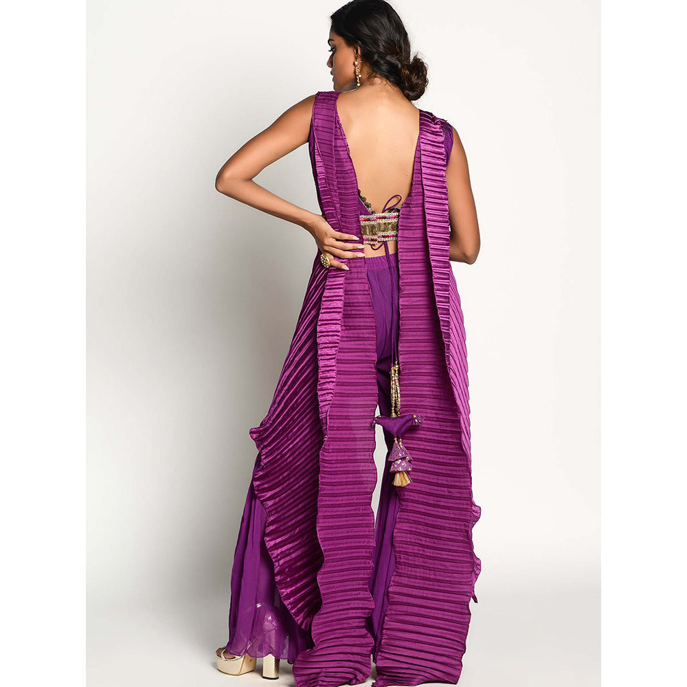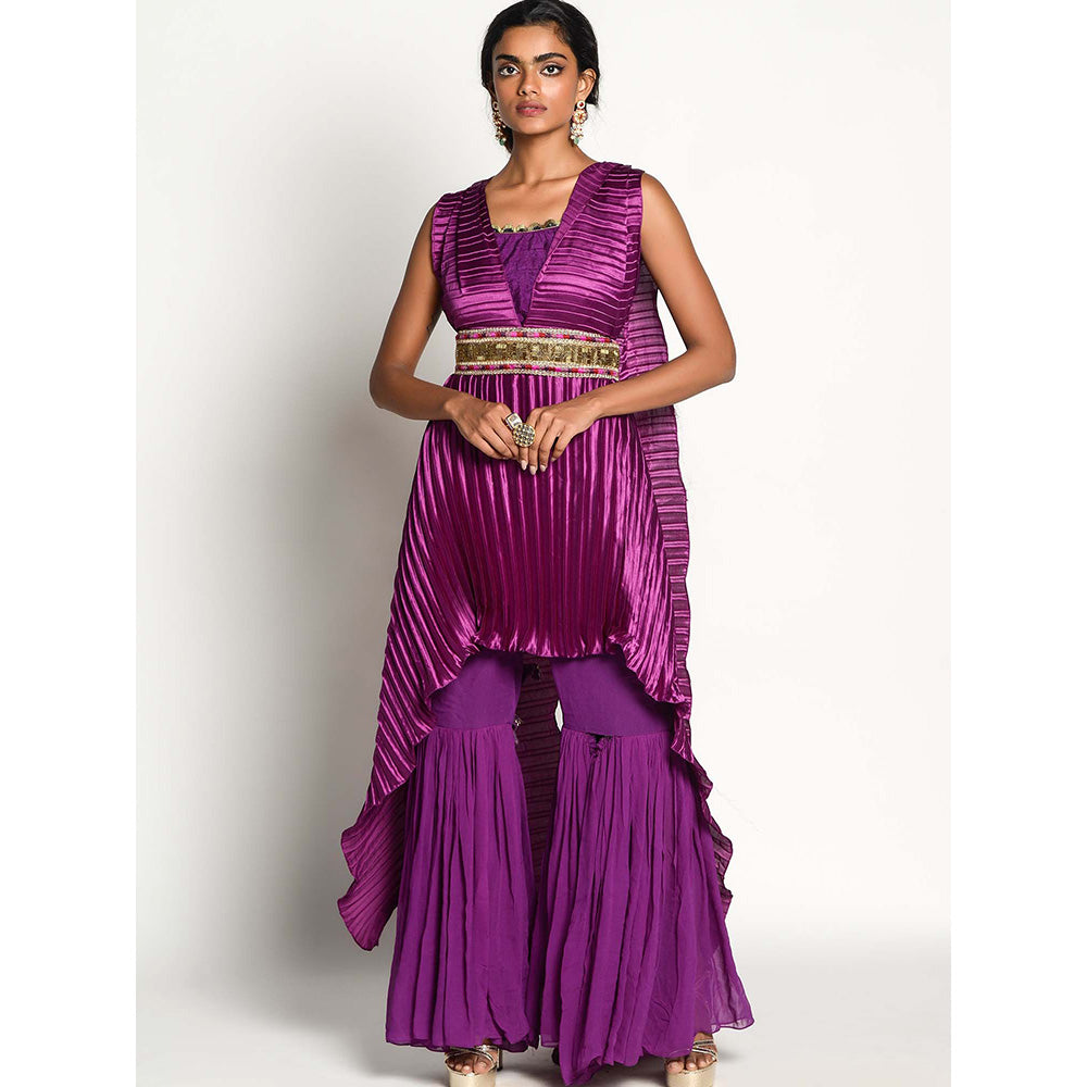 Description : The heat set pleated drape set is offset with cutdana, dabka and threadwork belt attached at the waist line paired with blouse and gharrara.