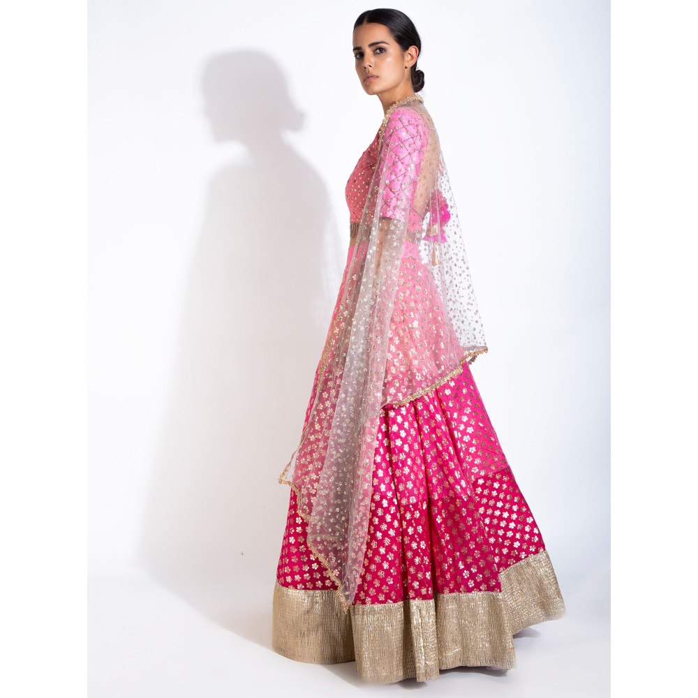 Rishi & Vibhuti Pink Lehenga & Stitched Blouse With Dupatta (Set of 3)