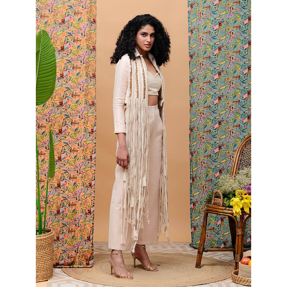 Description : Contemporize your overall semblance with this rose gold jacket, tube, and pants set from Rishi & Vibhuti. Fashioned using linen, it features a collar neck, sequined embellishment, and is accented with a normal fit. It will surely impress your peers. Style it with a pair of quilted heels and chandelier earrings for a classy look.
