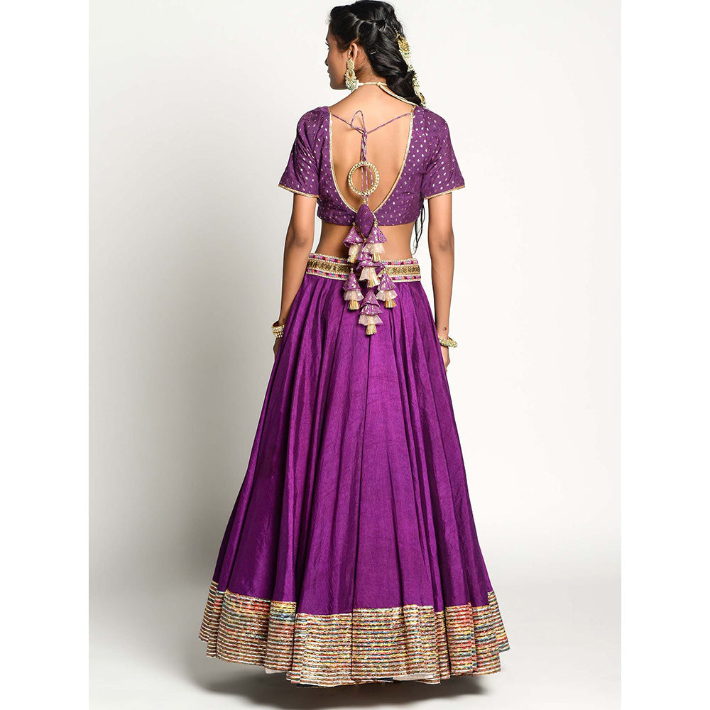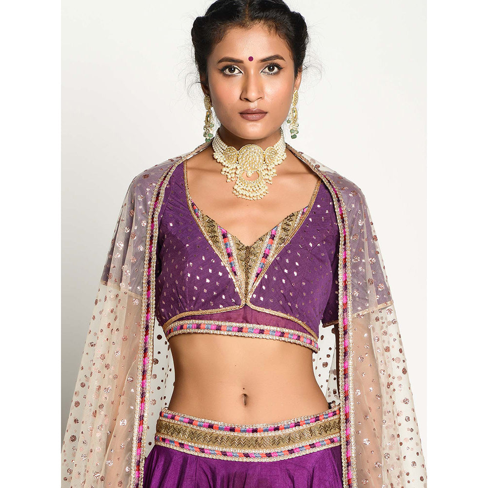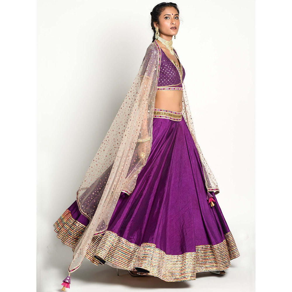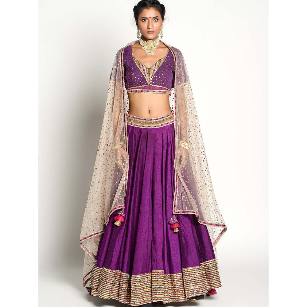 Description : The deep lavender zardosi lehnga is all set with blouse played with sequins, cut dana, dabka and thread work. It is offset with net dupatta with thread work border with the hand curated latkans at the four edges of dupatta.