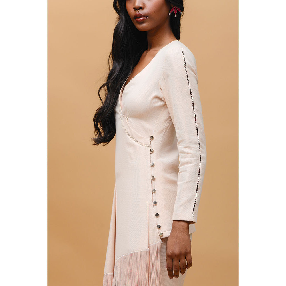 Description : A breathing illustration of fine craftsmanship, get hold of a refreshing look by donning this rose gold jacket and pants set from Rishi & Vibhuti. Fashioned using linen, it features a V-neck, button fly closure, and is accented with a normal fit. It will surely impress your peers. Style it with a pair of quilted heels and chandelier earrings for a classy look.
