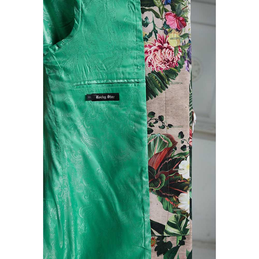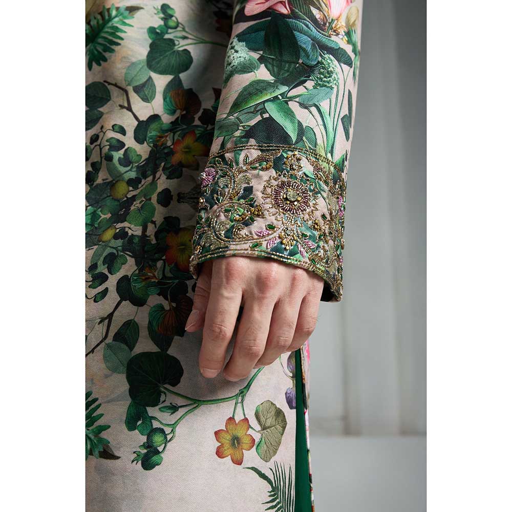 Description : The long beige sherwani features a high collar and is adorned with a vibrant, intricate floral pattern with plain white pants. The collar and cuffs are embellished with a more detailed floral design. Traditional footwear like mojaris or juttis, especially those with intricate embroidery, will complete your sherwani ensemble.