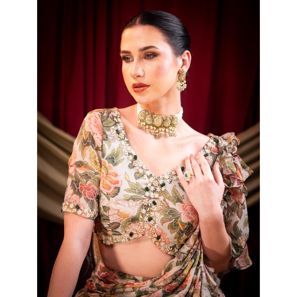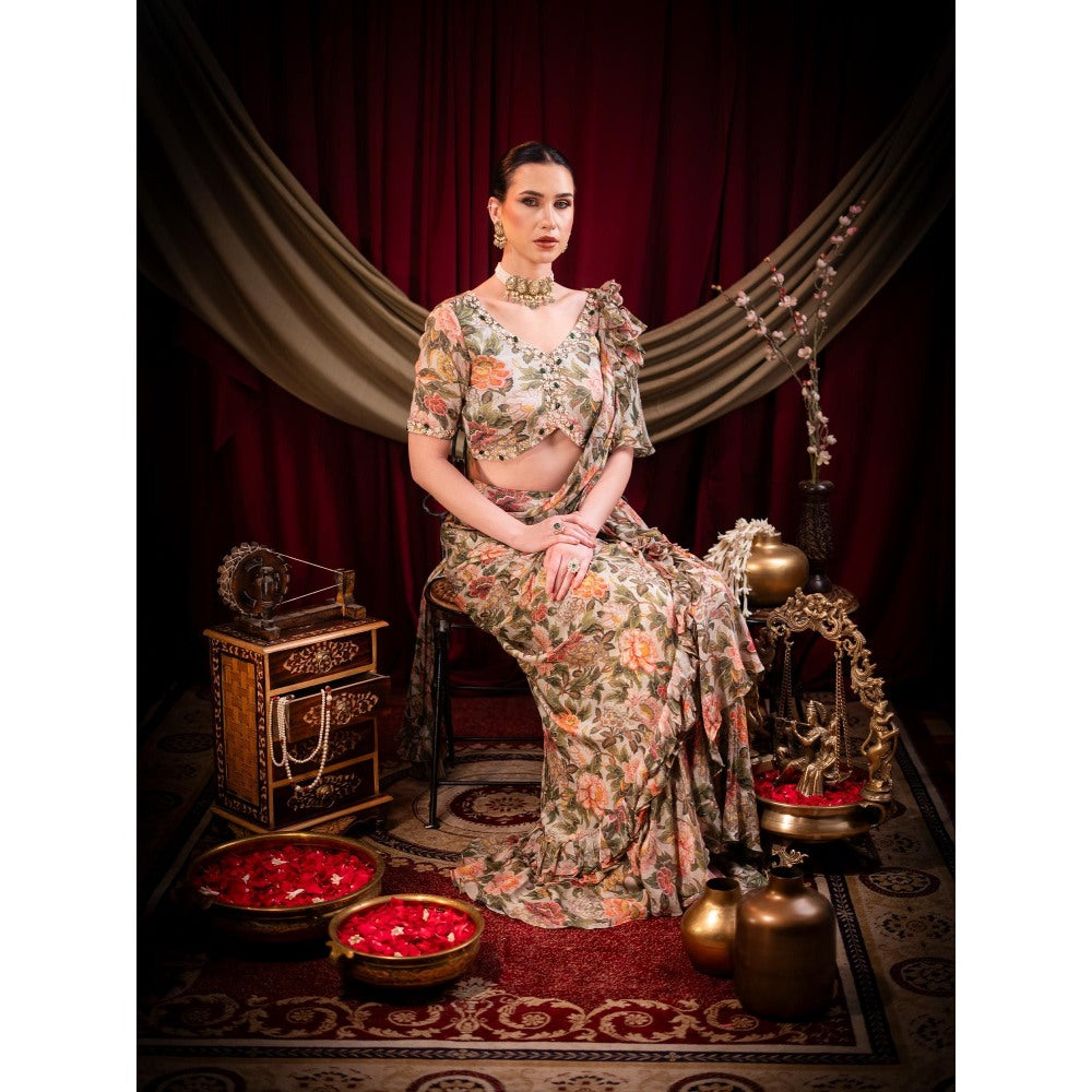 Description : This Vintage Royal Floral Print Pre-Drape Saree with An Embroidered Blouse Is Pure Maharani Vibes. Luxurious Fabrics, Intricate Embroidery, and Regal Colours Make It Fit For A Queen. Get Ready To Turn Heads and Feel Like Royalty!