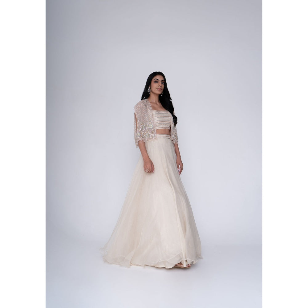 Description : Fully embroidered short cape with latkans , The outfit is paired with a beautiful bustier adorned with intricate embroidery on its front and back. An organza skirt with embroidery details on belt. Tailored to sartorial perfection from premium quality fabric, it assures a soft and soothing touch against the skin. The exquisite silhouette adds to its appeal.