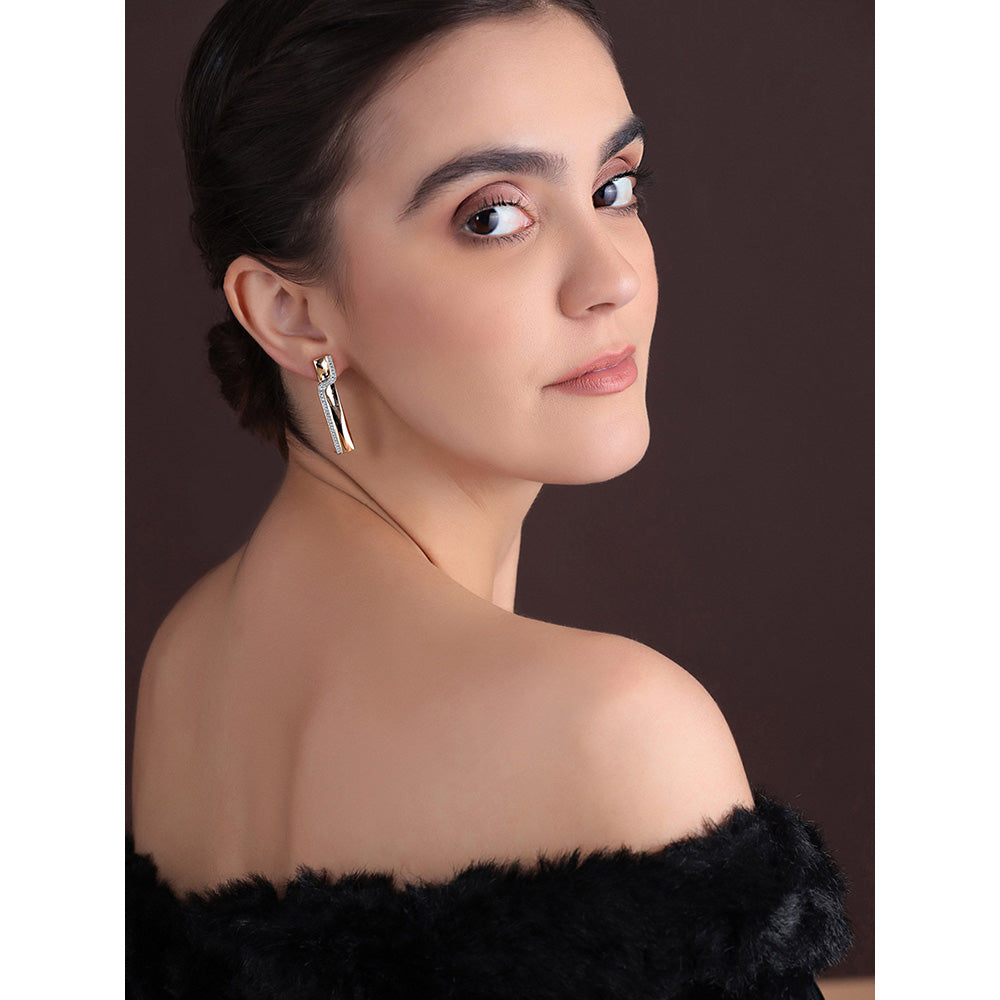 Description : Crafted beautifully with linear designs, these structured earrings are perfect for angled accessory lovers. The sleek and smooth design with a drop look makes it the perfect pair for working professionals.These danglers are created on a base of brass and embedded with cubic zirconia stones.These earrings offer a smooth wear ability feature with its post and back closure.Set a style statement of your own with these earrings.