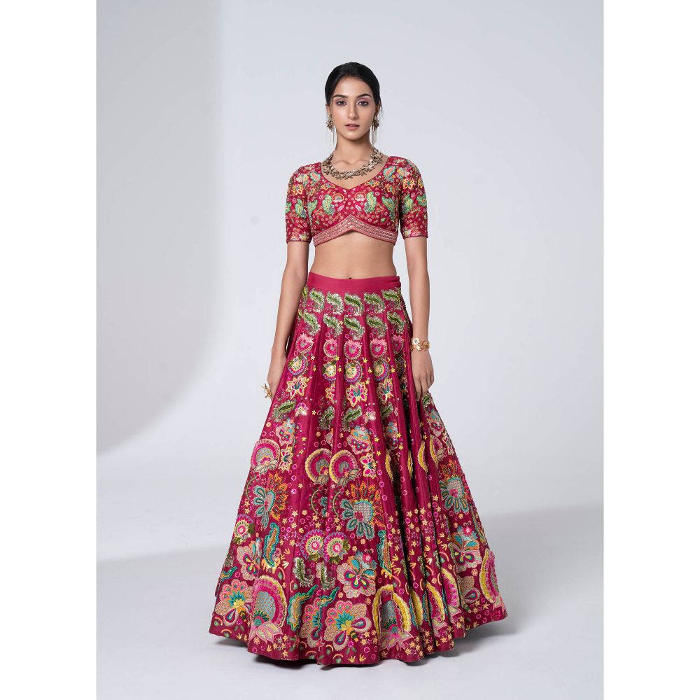 Siddhartha Bansal 3D Embroidered Burgundy Lehenga with Blouse and Dupatta (Set of 3)
