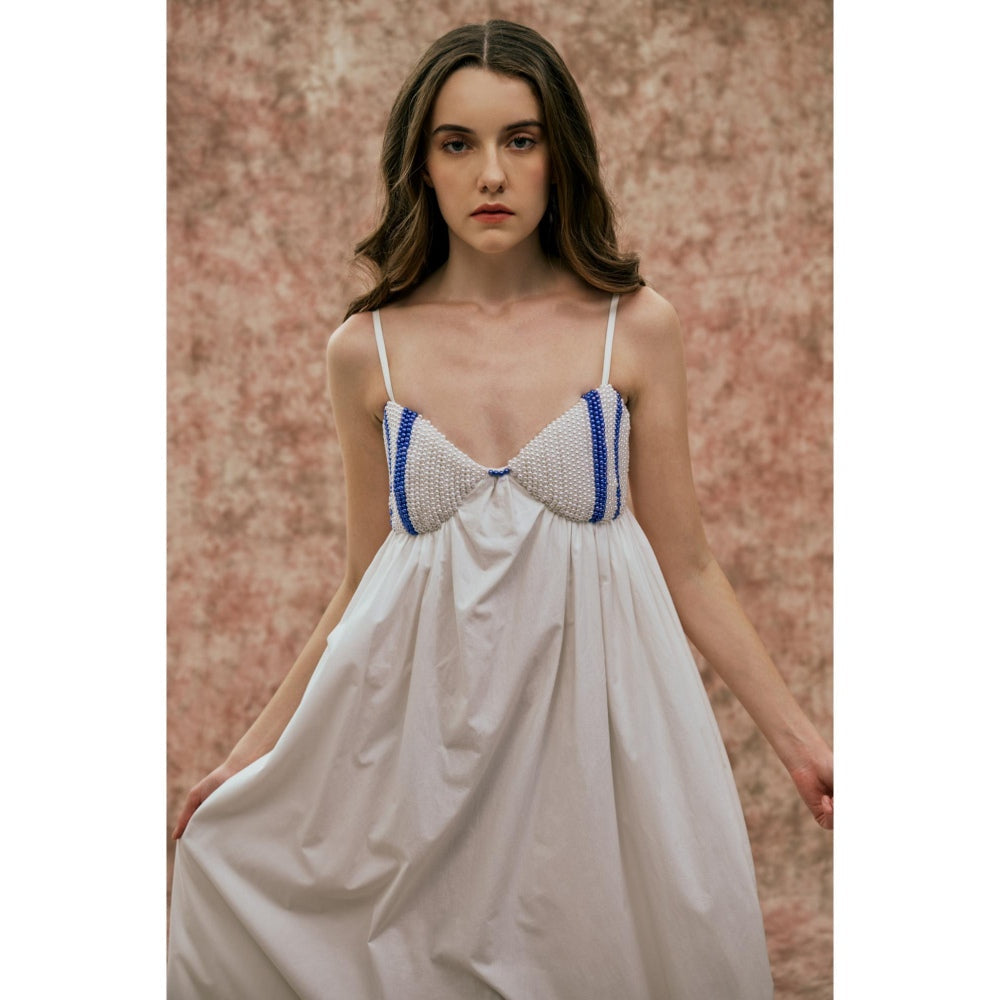 Description : A flowy white maxi dress designed with thin straps and a relaxed silhouette. The bust features blue striped panels embellished with pearl details. Ideal for summer gatherings, resort wear.