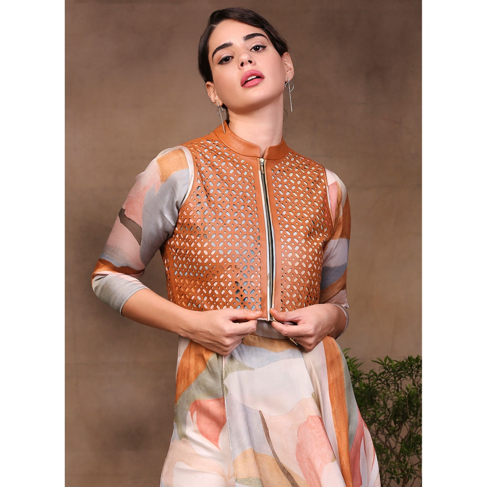 Description : Watercolour printed asymmetric top and pant with short jacket