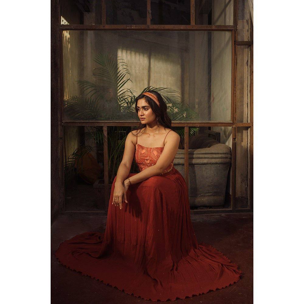 Description : Solid Rust Ari And Thread Hand Embroidered Crop Top With Cut-Dana, Sequence Spluttered 3 Tiered Lehenga Skirt.