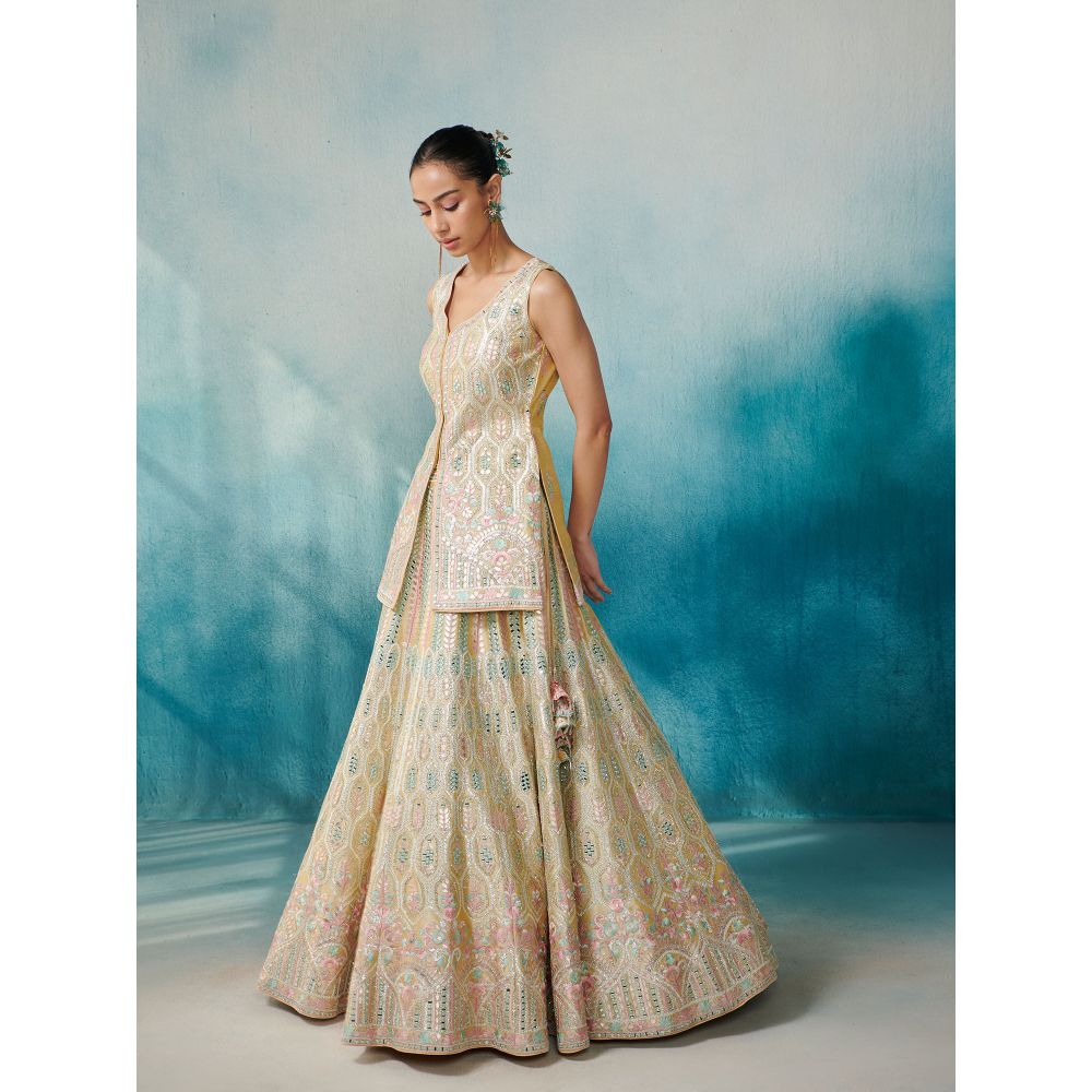 SUHINO Lemon Yellow Slub Silk Lehenga Jacket Inner & Dupatta (Set of 4)