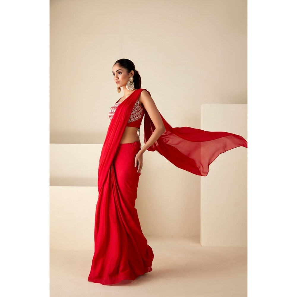 Suruchi Parakh Red Embroidered Pre Drape Sarees and Blouse with Stitched