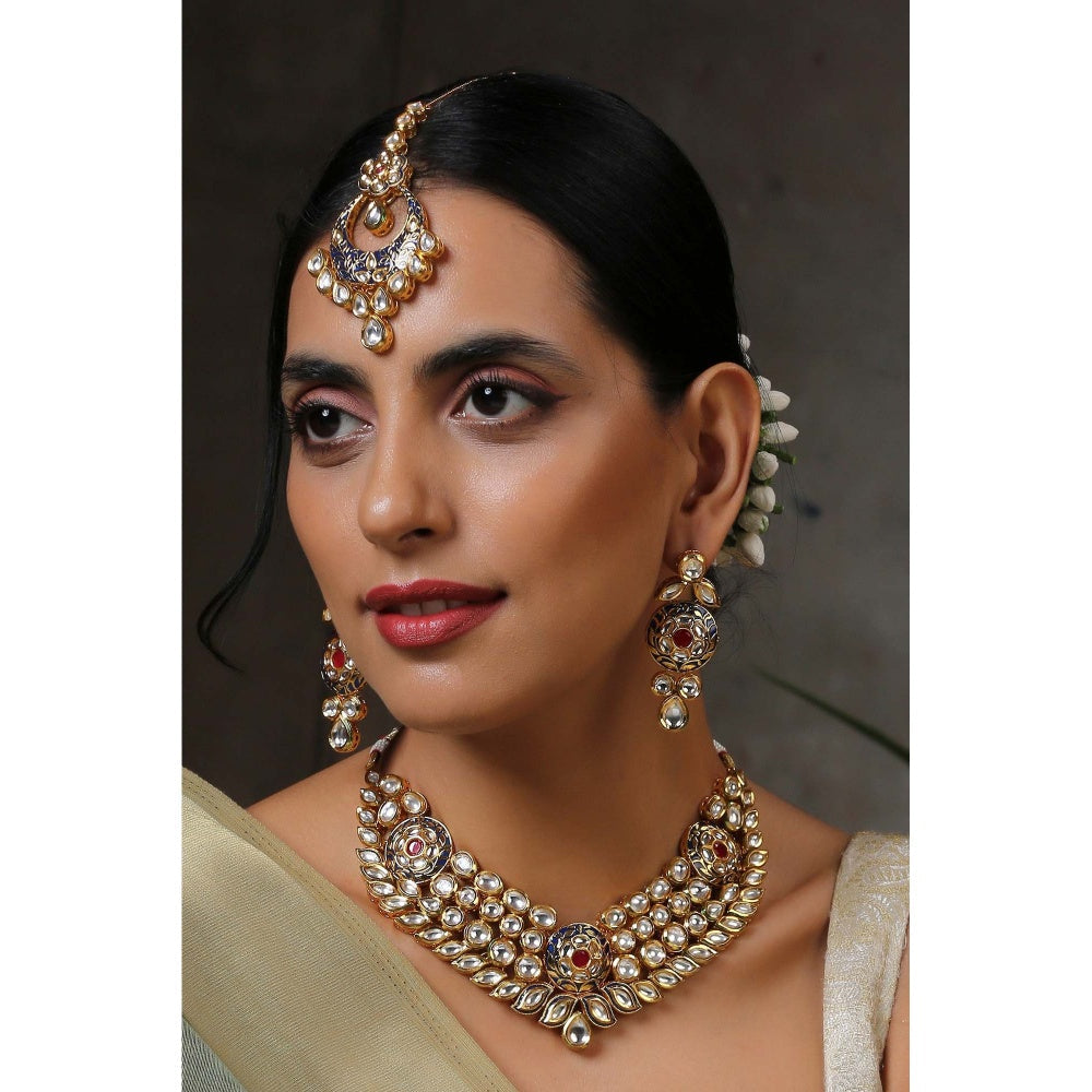 SWABHIMANN Hamsha Blue Gold Plated Kundan Necklace with Earrings Set