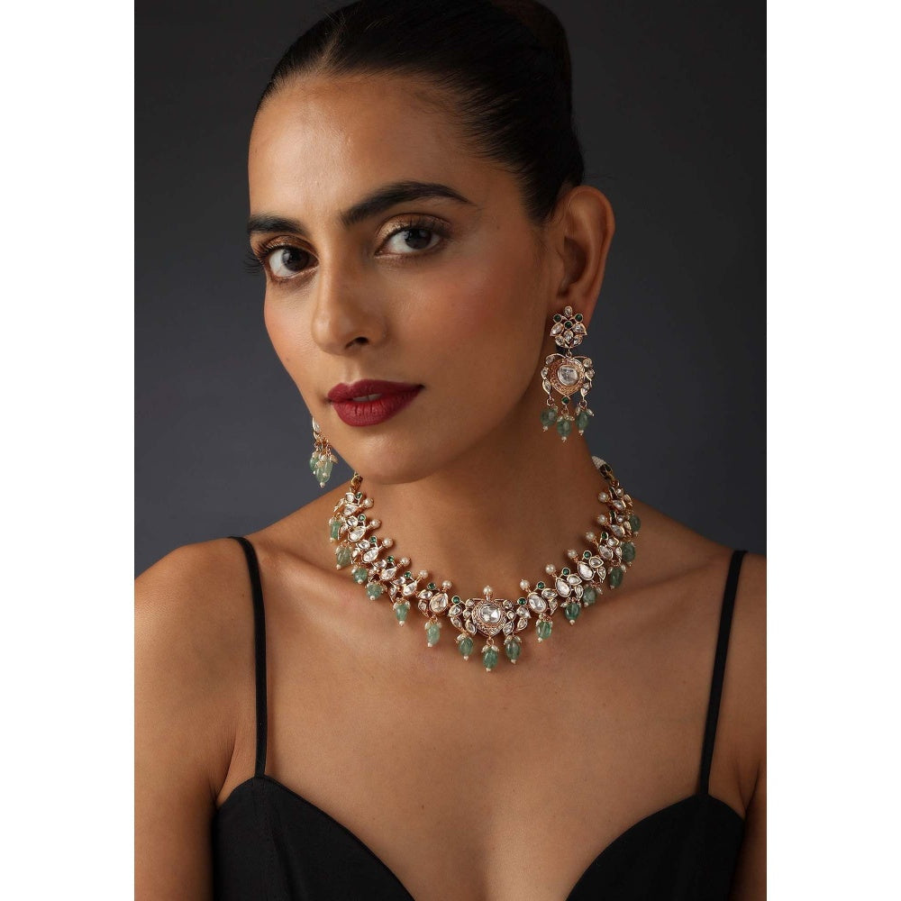 Sathya Green Polki Silver Choker Necklace with Earrings Set