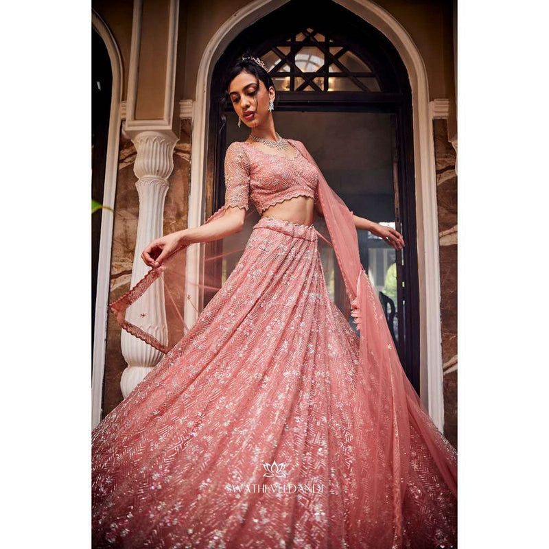 Description : Add a dash of style to your wardrobe with this peach lehenga set from SWATHI VELDANDI. Crafted from net, this stylish set is finished with half sleeves and a V-neck. Style it with a pair of heels and statement jewellery.