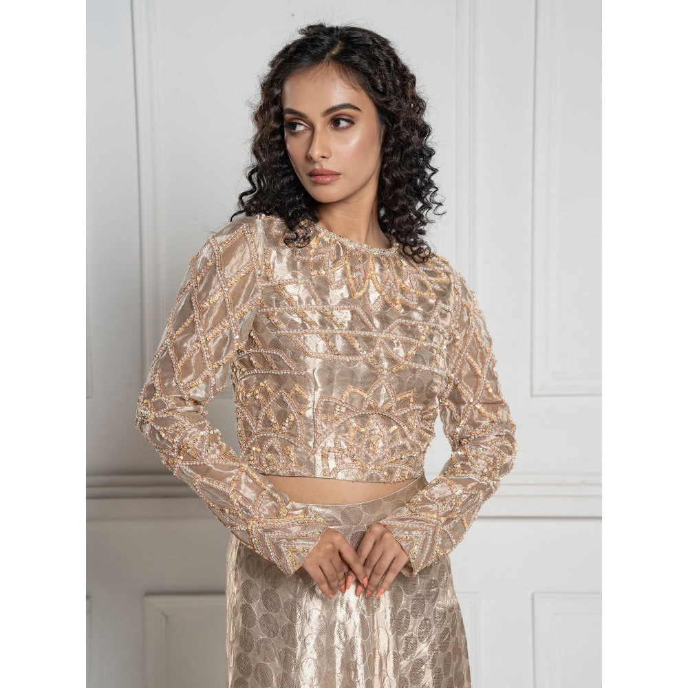 Description : skirt seamlessly joined with cropped top featuring intricate hand embroidery in it