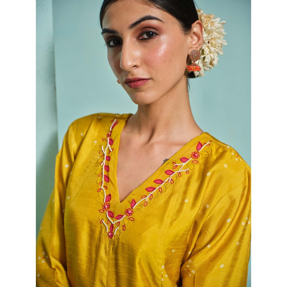 Description : Dress-up elegantly with this yellow kurta set from The Clothing Therapy. Made from high-quality raw silk, it features pull on closure and embroidered pattern along with three fourth sleeves & v-neck design. Pair it with minimal jewellery to complete your ensemble.