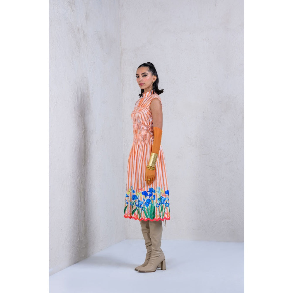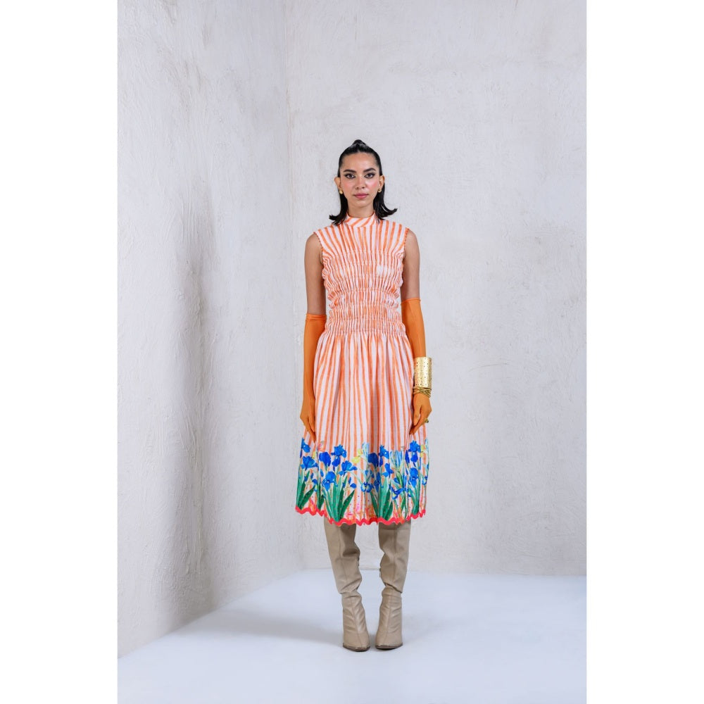 Description : Featuring This Orange Striper Smocked Dress With Contrasting Floral Print Accompanied With A Scalloped Hem Is Your Perfect Daytime Soiree Fit.