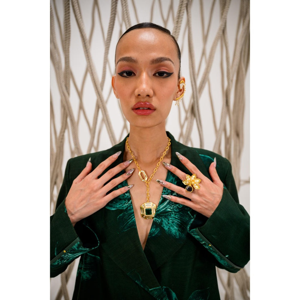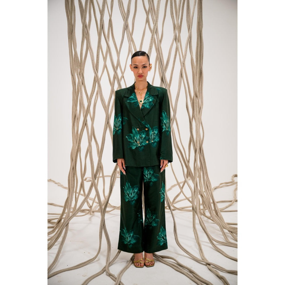 Description : Never compromise your comfort and style with the Lismore Blazer! On a deep green base, photogenic lilies burst to life, accentuated by green leather strips that trace their delicate carpels. Miniature golden studs dot the lily stigma, creating a mesmerizing 3D effect. This oversized silhouette marries maximum comfort with high-fashion flair, featuring a sleek notch lapel and golden Dramebaaz custom buttons that elevate the look. Pair it with the matching Lushmore Trousers featuring the same lush floral print and an oversized, relaxed fit for a complete statement look that combines ultimate comfort with effortless style.
