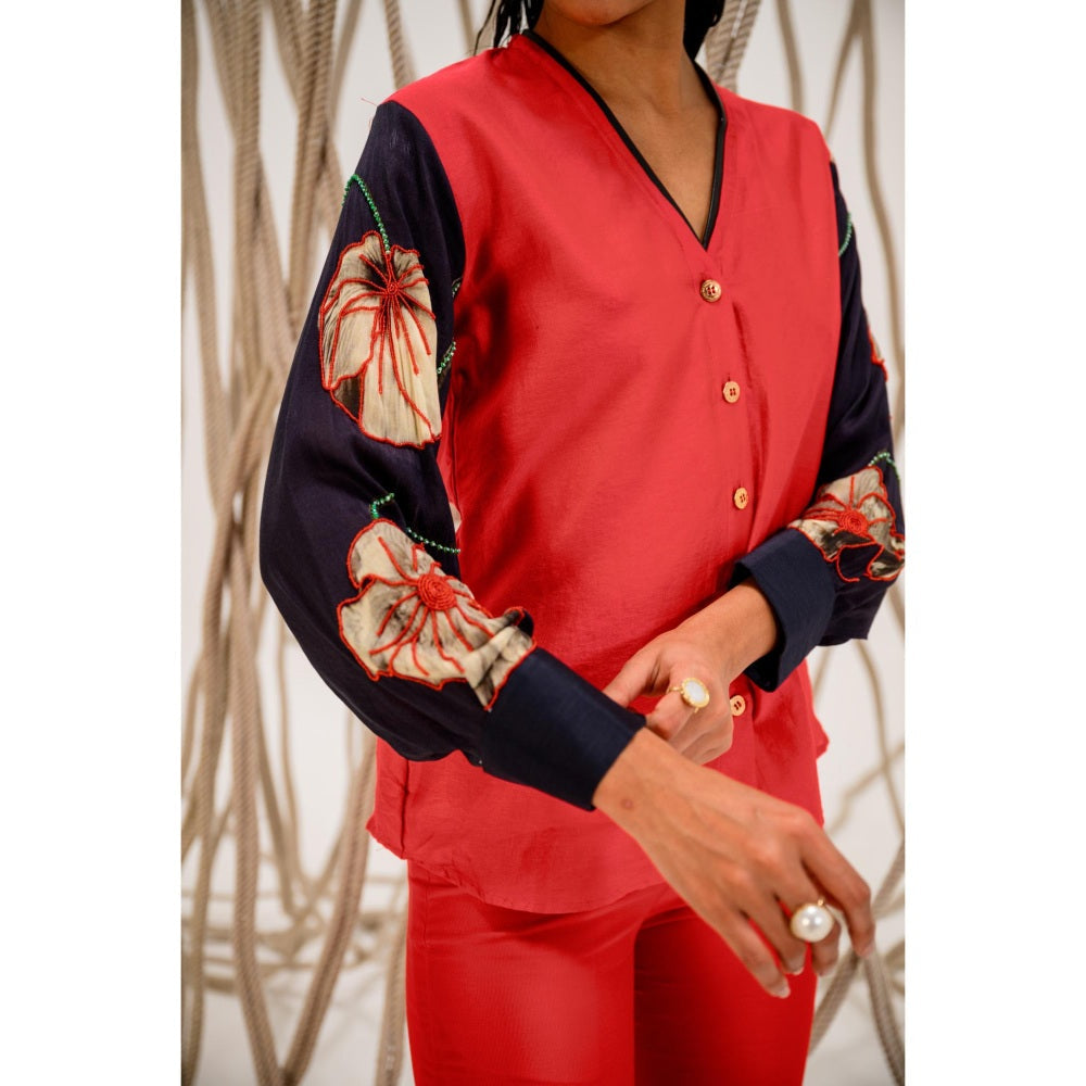 Description : Unveil elegance with the Eclipse Shirt, crafted from the purest Chanderi silk for an irresistible sheen. This red beauty features a chic V-neckline, accented with contrasting black leather for a bold touch. The black printed sleeves are adorned with intricate handwork, showcasing vibrant red beadwork and shimmering green sequins on florals, while the rest of the shirt remains elegantly understated. Finished with golden customized Dramebaaz buttons, the Eclipse Shirt strikes the perfect balance between opulence and simplicity.