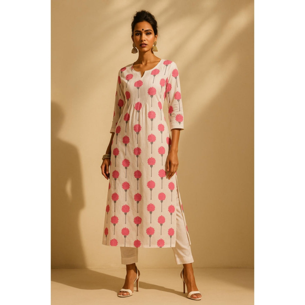 Thee Modern Roots Women'S Ivory Cotton Floral Round Neck Kurta with Pant