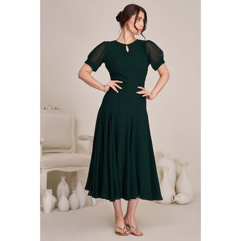 Description : Revamp your closet with this green georgette midi dress for women - featuring half sleeves, a chic keyhole neckline, and a flattering fit and flare silhouette. Perfect as a midi party dress, women's gown, or stylish western dress for women.Ideal for any occasion, it s designed to flatter with ease and sophistication.