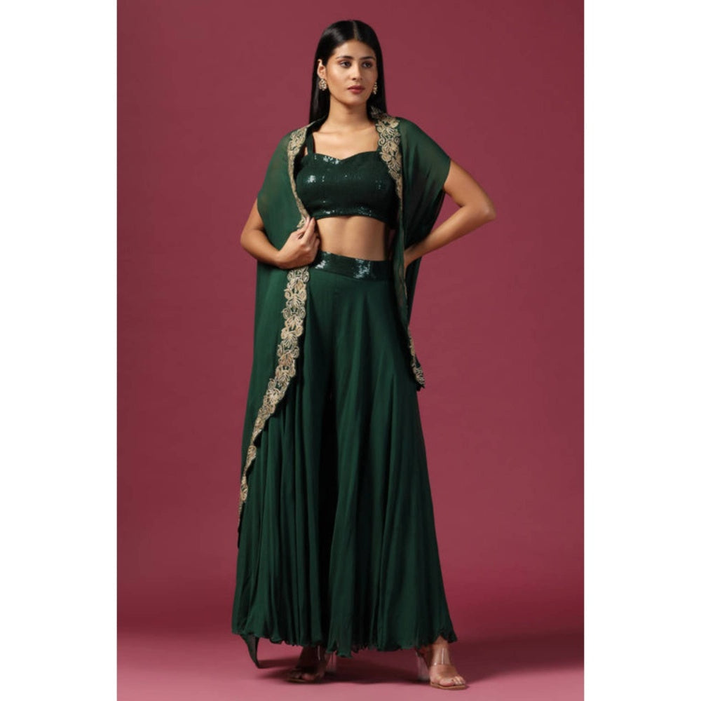 Bottle Green Cape With Thread Embroidered In Floral Pattern On Placket, Paired With Sequins Embroidered Crop Top And Palazzo.