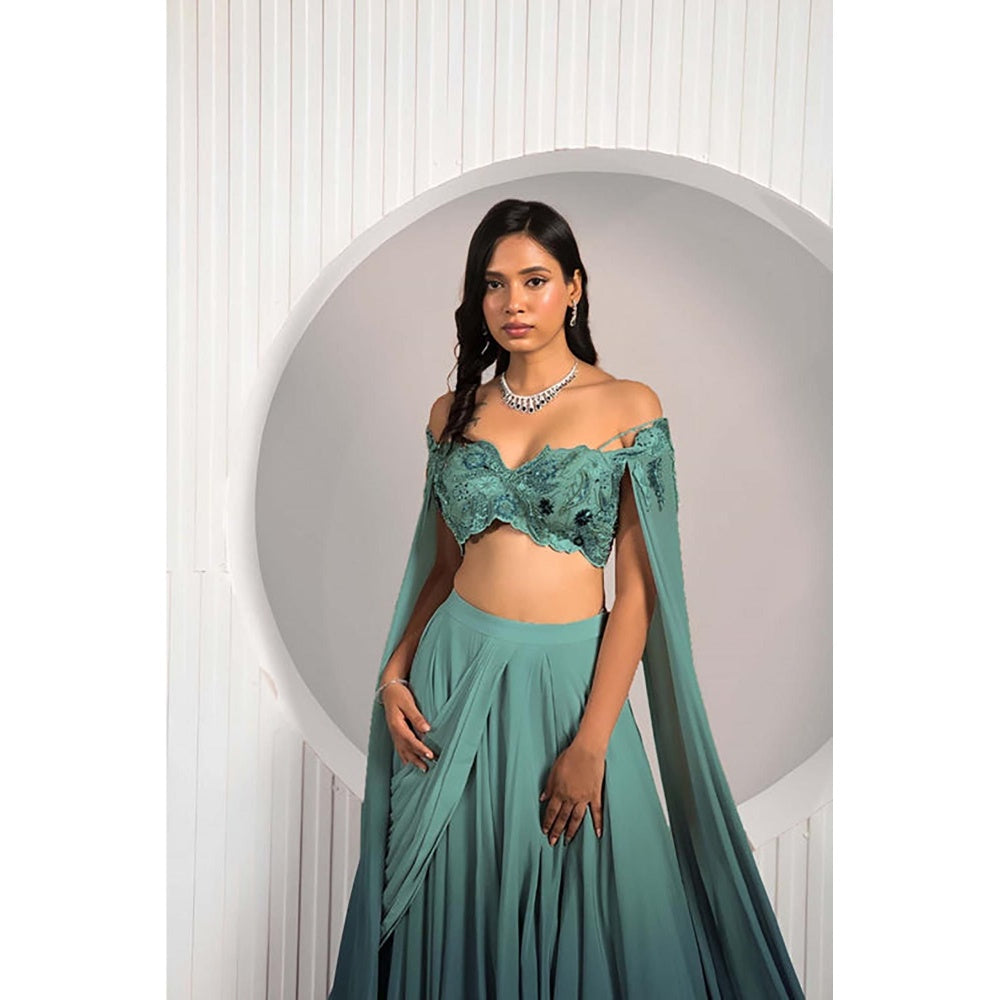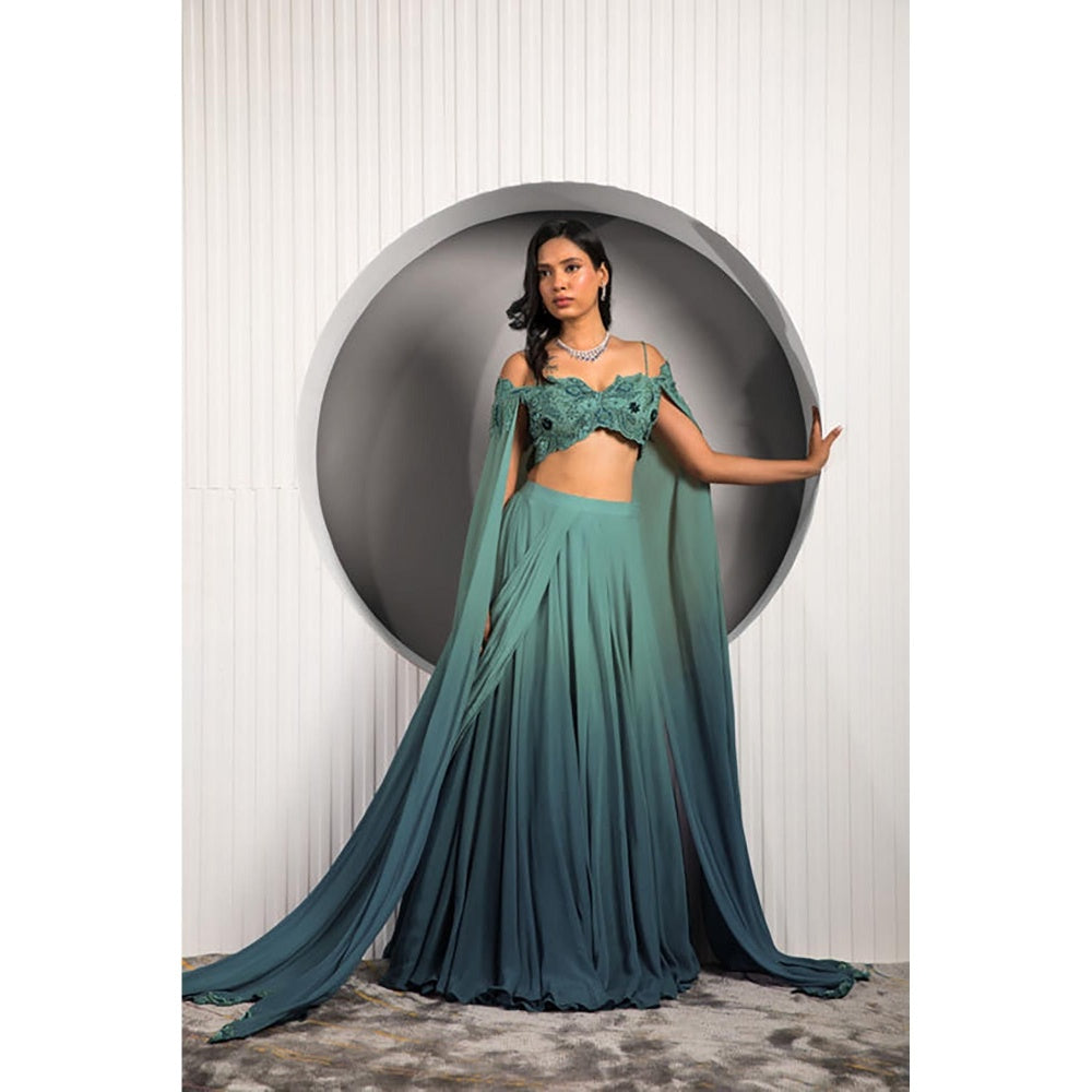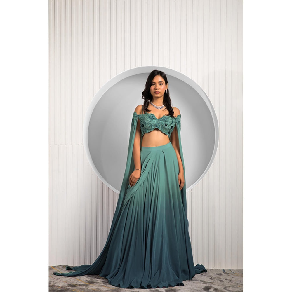 Grace Any Celebration With Refined Elegance In Our Teal Ombre Cape Blouse Andamp; Flared Skirt Set, Designed To Make A Lasting Impression. The Standout Cold-Shoulder Cape Blouse Features Tonal Embroidery With Zari, Resham, Crystals, And Stones, Adding A Touch Of Shimmer That Catches The Light Beautifully.