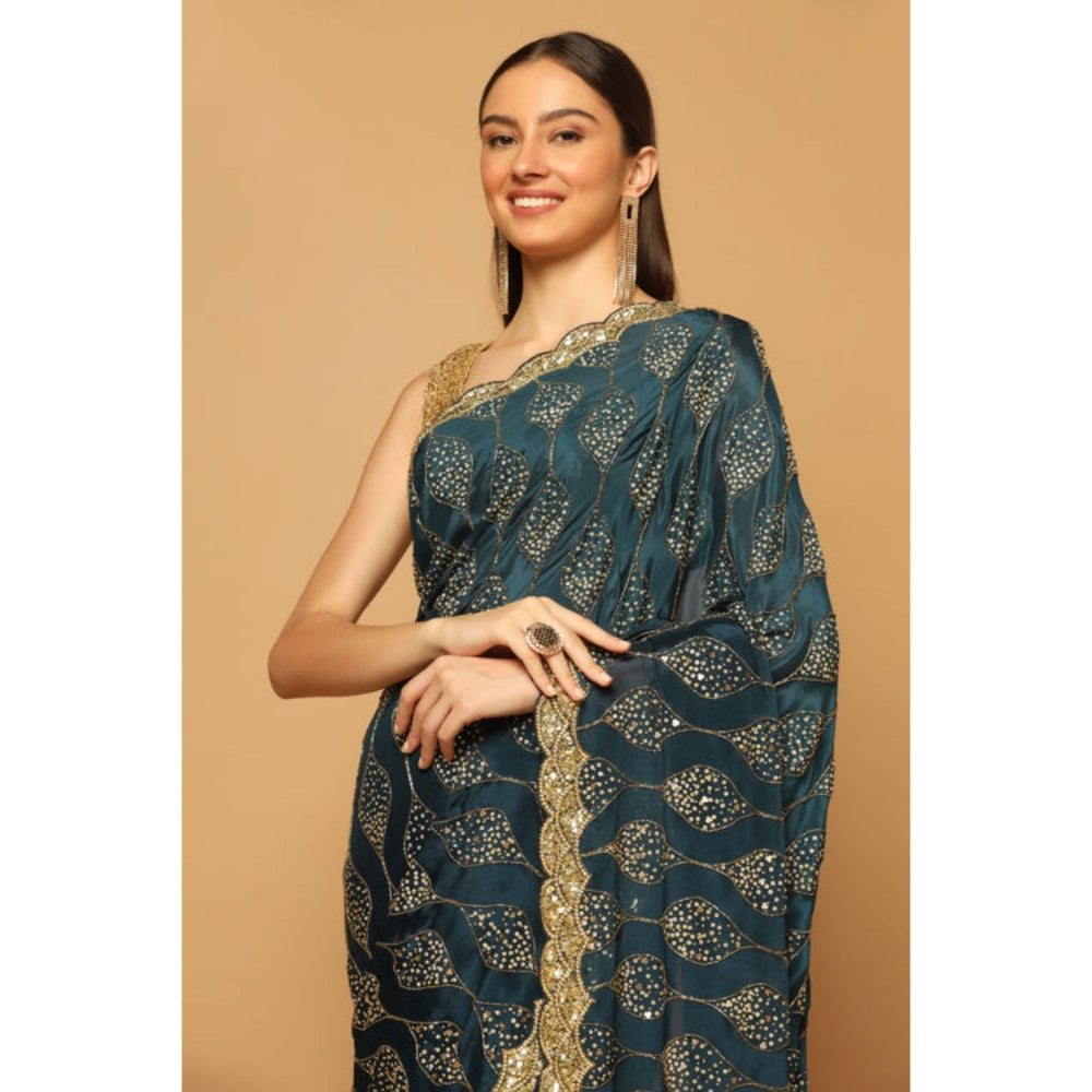 Teal Gold Jaal Embroidered Saree with Unstitched Blouse