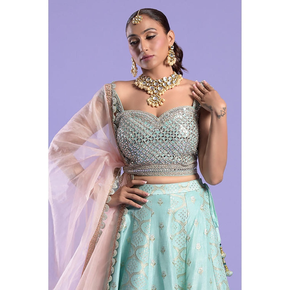 Experience Timeless Elegance With Our Handwoven Turquoise Kalidar Lehenga Set, A Masterpiece Of Artisanal Craftsmanship. This Luxurious Ensemble Features A Flowing Kalidar Lehenga Adorned With Intricate Banarasi Woven Kalis Accented With Subtle Gold Highlights, Creating A Regal Silhouette. The Raw Silk Blouse And Matching Dupatta Are Exquisitely Embellished With Delicate Zari, Mirror, And Sequin Work, Adding A Refined Sparkle To The Ensemble.