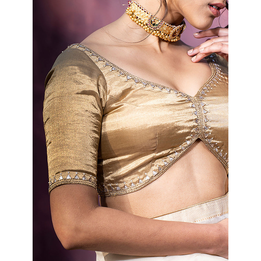 WeaverStory Hand Embroidered Golden Tissue Silk Blouse with Gota Patti