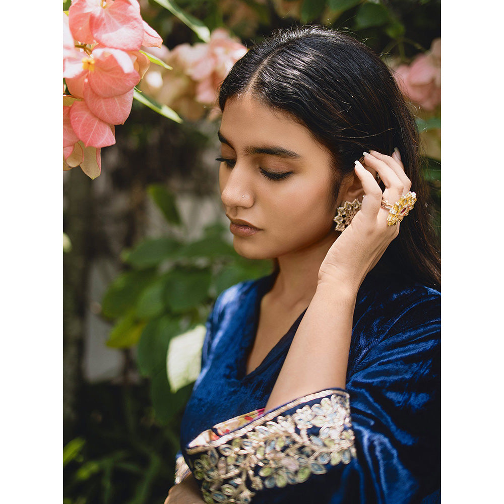 Description : Embody poised elegance in this navy blue kurta set from WeaverStory. Fashioned from velvet and adorned with zardozi work, the kurta is finished with three fourth sleeves and a V-neckline. The kurta is accompanied by a matching salwar to complete the ensemble.