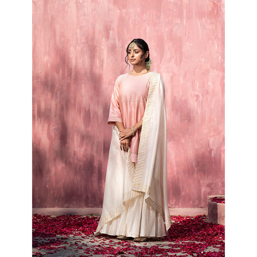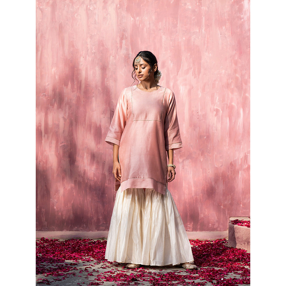 Description : The Chanderi silk pink short kurta features minimalistic zari work on the neckline and is the true representation of how beauty lies in simplicity. The kurta is complemented with a stitched off-white sharara that looks equal part elegant and dramatic. To complete the look, add the off-white embroidered dupatta that features matching zari work and intricately placed sequins on the border of the dupatta. Wear this outfit to a celebration at the office or a friend s mehendi party and you are to stand out with your choice of shade and style. Gota handcraft was traditionally the domain of the royalty which is why this ravishing piece looks every bit gorgeous.