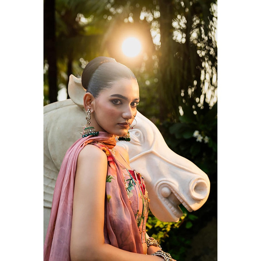 A Stunning Dusty Rose Pink Lehenga Set. The Look Features A Short-Sleeved, Deep-Neck Blouse With Striking Criss-Cross Detailing At The Neckline And Hand Embroidery With Sequins And Crystals. The Lehenga Is Designed With Embellished Belt Accents And Functional Pockets, And A Printed Handwork Dupatta Edged With Crystal Lace.