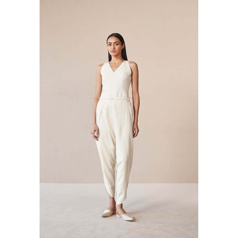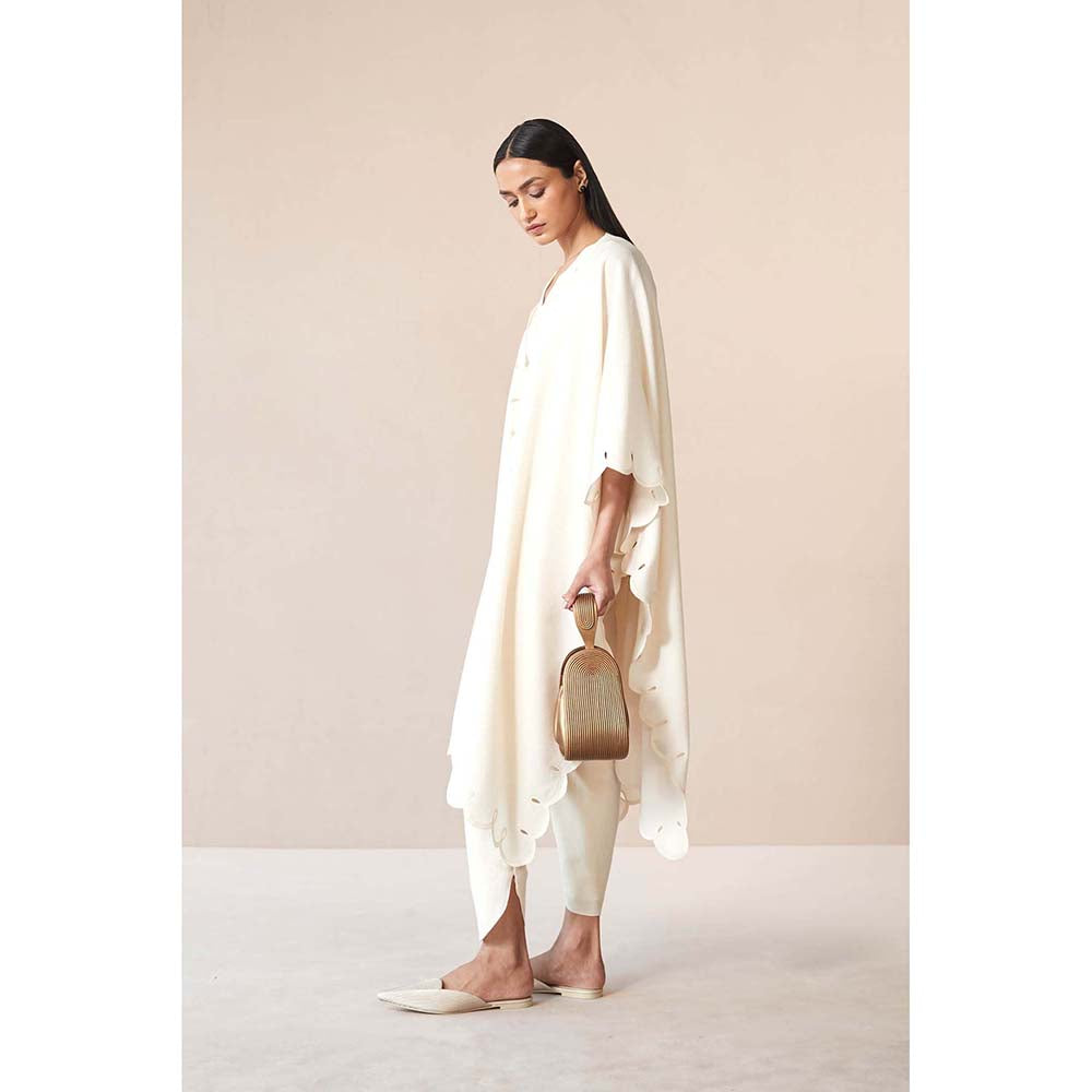 Description : Channel style and elegance in this white cape with inner, dhoti and belt from AMPM. Crafted from wool, this alluring set is finished with cape sleeves and a V-neck. This gorgeous set is perfect for parties and festive occasions.